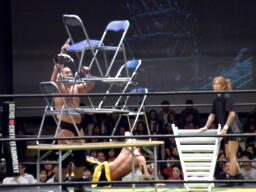 KUDOダイビングダブルニーアタック(右写真)、カウント2。