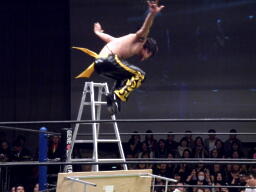 KUDOはキャッチ延髄で高木を場外に落とすとトペ・スイシーダ(右写真)。ウラノもサスケを場外に。