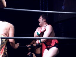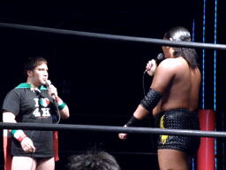 大鷲と星誕期はちょっとモメるがトーゴーとアントンが襲い掛かるとダブルのビッグブーツで撃退、握手。イタリアンフォーホースメンは早々に引き揚げ、大鷲がマイク。「誕期さん、今の最後はちょっとだけNo Perfectだったけど、次の後楽園は同じコーナーに立ちたいんだよ俺様。」