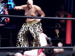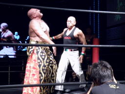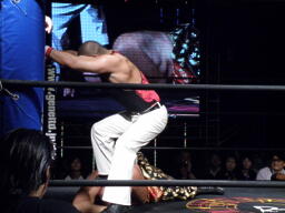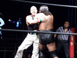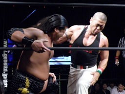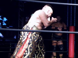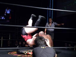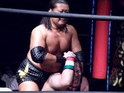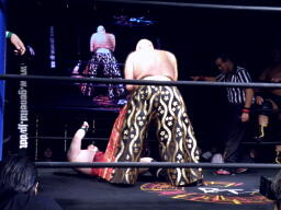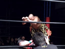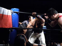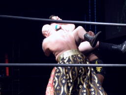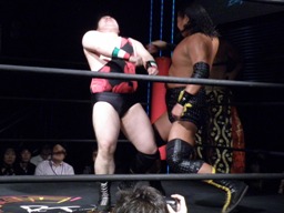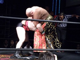 ロックアップ、星誕期投げ飛ばす。アントンは「髪をつかまれた」とアピール。大鷲「つかむほど髪ねえぞ!」再度ロックアップ、アントンは星誕期の足を踏んでショルダーブロックに行くが逆に吹っ飛ばされる(左写真)。