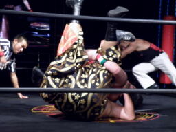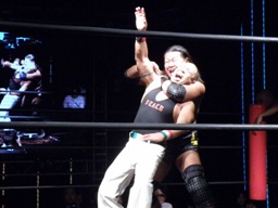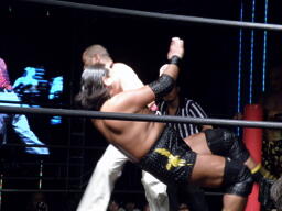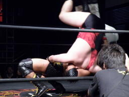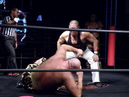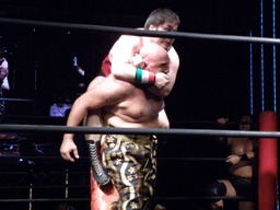星誕期キャッチしてボディスラム(右写真)。さらにノド輪落とし狙うがアントンが急所蹴りで阻止。トーゴードロップキック、アントンにタッチ。10分経過。