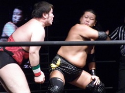 先発はトーゴーと大鷲。ロックアップからトーゴーがヘッドロック。大鷲がロープに振ってショルダーブロックの打ち合い(左写真)。