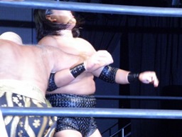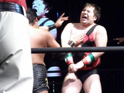 大鷲キャメルクラッチに捕らえアントンの髪をつかむ(左写真)。アントンコーナーに押し込んでトーゴーにタッチ。場外に降りてしばし泣く。