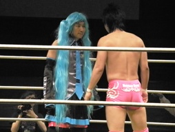 今日の安部のコスプレは初音ミク。入場テーマも「みくみくにしてあげる」。先に入場の石井と睨み合い(右写真)。