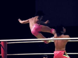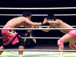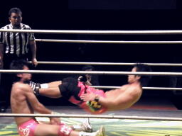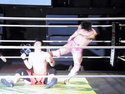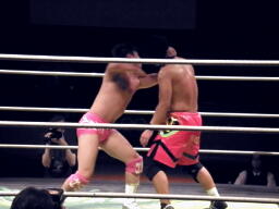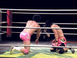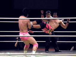 安部延髄蹴り(左写真)、石井エルボー、安部延髄蹴り、石井エルボー、安部延髄蹴り、石井エルボー、ダブルノックダウン。12分経過、残り試合時間3分。