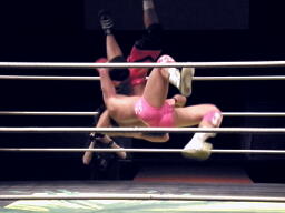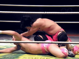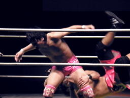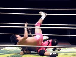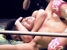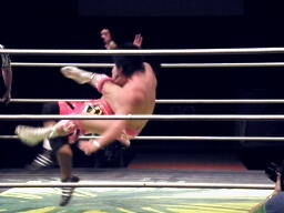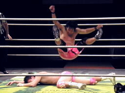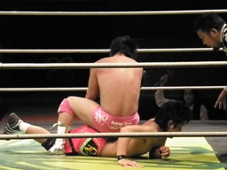 安部ロンギヌスの脚、石井ブロックしてバックドロップ、安部は体をひねって押しつぶす(左写真)。