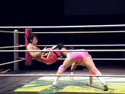 再度手四つからバックの取り合い、石井が腕をひねる、安部切り返す(左写真)。石井エルボー打ち込んで切り返す。