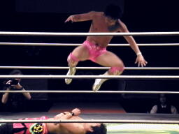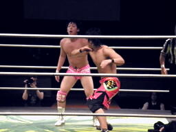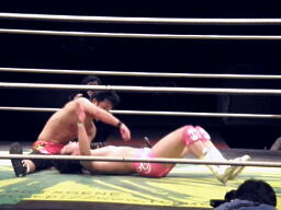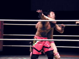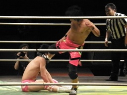 石井ジャーマン狙う、安部ブロック、バックの取り合いから石井ランニングニーアタック(左写真)、カウント2。