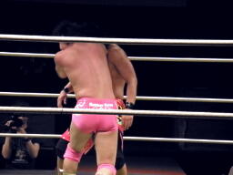 安部ボディスラムから何回もカバー繰り返す、石井は2で返す。3回目に返されるとその勢いを利用してジャンピングギロチン、カウント2。これはいい動きだ。石井立ち上がってエルボーの打ち合い(左写真)。石井ロープに飛ぶ、安部追いかけてキチンシンク、コーナーに上ってミサイルキック、カウント2。