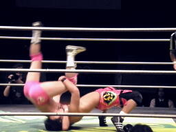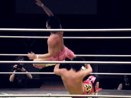 安部首投げ、エプロンに出てトペ・アトミコ(左写真)、カウント2。