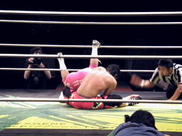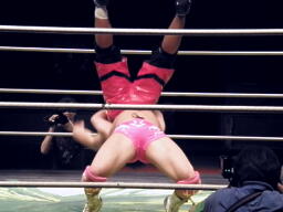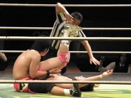 安部逆さ押さえ込みの体勢でくるくる回してからスクールボーイ(右写真)、カウント2。あわや3カウント。