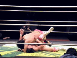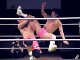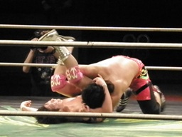 距離を取って安部の顔面にニールキックを叩き込む(右写真)、カバー、カウント3。
