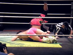 安部スライディングから回転エビ固め(右写真)、カウント2。