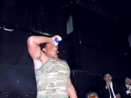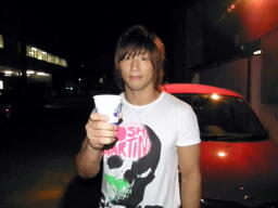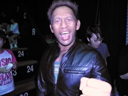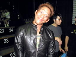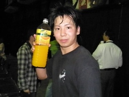 試合後ソフトドリンクパーティー。「グッズ売店跡」(新藤リングアナ)のテーブルに各種ソフトドリンクが用意されるが取りに行くと混雑してるので自分の席に戻って飲む。パーティーという感じではないな。そうこうするうち選手が客席を回りだす。ちょっとすいたのでテーブルに行ってマイケルの写真を撮る。なんか色合いが変になったので(左写真)もう一度フラッシュ使用でとお願いすると、