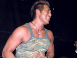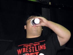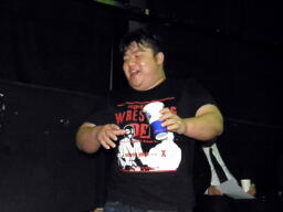 ソフトドリンクパーティーは終宴したが、なかなか客が出ないのでNOBUさんが選手に指示し、選手ごと出す方法に。うまい。素直に外に出た飯伏(右写真)。