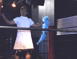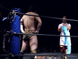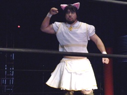 マイケル「ナース服、今までありがとう。」(左写真)。しかし長いので松井レフェリーが「もういい!」と場外に蹴っ飛ばして強制終了。