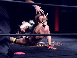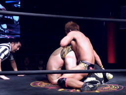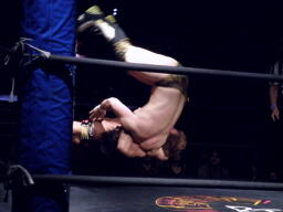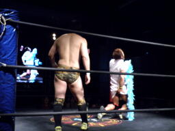 佐藤切り返してヘッドロック(左写真)からフライングメイヤー、マイケルヘッドシザーズで返す。佐藤頭を抜いて再度ヘッドロック、マイケルはエビ固めに、カウント2。