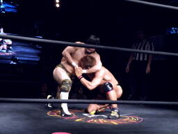 ロックアップ、今度はマイケルがヘッドロック(右写真)、佐藤ロープに振ろうとするがマイケルブロック。佐藤ヒジ入れてロープに振る、マイケルショルダーブロック。