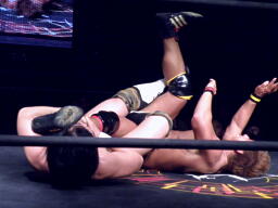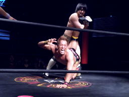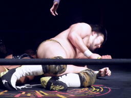 佐藤は前転してヒザ十字に、マイケルタイツをまくり上げながらのエビ固め(右写真)、カウント2。