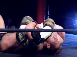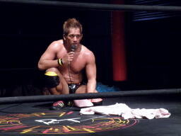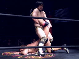 佐藤レッグロック(左写真)、マイケルこれもロープエスケープ。佐藤スタンディングアキレス腱固め、マイケルは下から蹴ってブレーク。佐藤足にストンピング、足をロープに絡めてショルダータックル、キック連打。