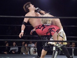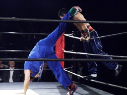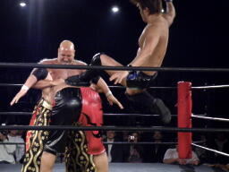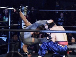 星誕期はブエノスアイレス午前零時を狙ってコーナーに、するとKYOHEIが背後からキック(右写真)、星誕期ペドロの上に落下しプレスする形にはなるが落下ダメージのためカバーには行けず。