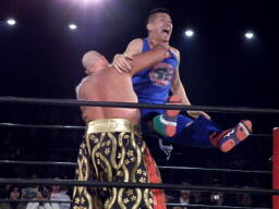 石川が6番目入場のハードヒット代表・タノムサク鳥羽にヒザ蹴り(右写真)、鳥羽はローキック。そのまま両者場外に。