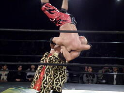趙雲ロープに飛ぶ、KYOHEIキャッチして首固め(右写真)、カウント3。