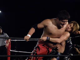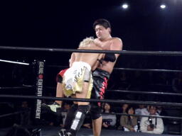 趙雲がロープに飛ぶ、KYOHEI裏切ってカウンターのドロップキック、ストンピング。石川KYOHEIに今度はベアハッグ(右写真)。