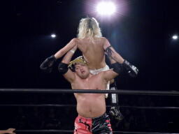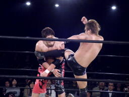 石川と星誕期はショルダーブロックの打ち合い、星誕期ロープに飛んでクロスボディ、カウント2。星誕期ブレーンバスター狙うが石川ブロックしてニーリフト(右写真)、ロープに飛ぶ、星誕期ラリアット。