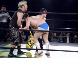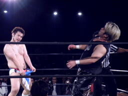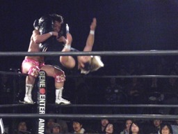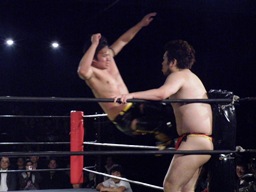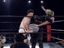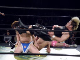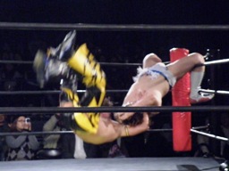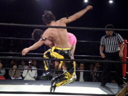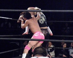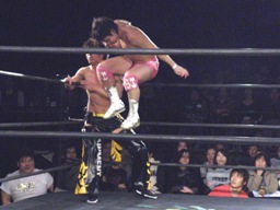 ウラノが雪崩式フランケンシュタイナー、KUDOダイビングダブルニーアタック(右写真)、ウラノがジャックナイフ、カウント2。