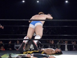 そしてKUDOがダイビングダブルニードロップ(右写真)、カウント3。