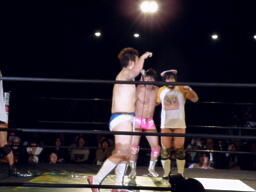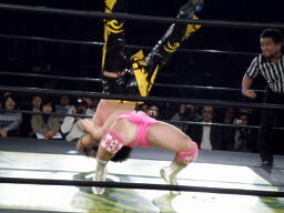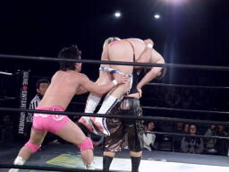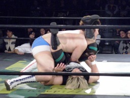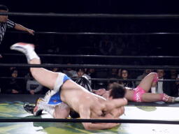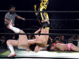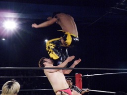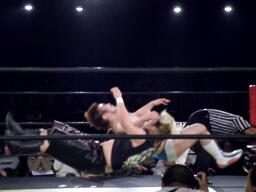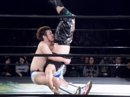 ディーノはコックボトムからナイトメア(右写真)、KUDOがエルボーでカット、ディーノはウラノの顔面に座り込もうとするがウラノはエビ固めに、カウント2。
