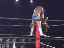 ディーノがコーナー上で尻を出してスタンバイ。石井がウラノを振る、ウラノ切り返す、石井さらに切り返してウラノの顔をディーノの尻に(右写真)。
