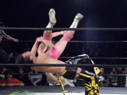 しかしウラノは松井さんの顔をディーノのタイツに突っ込むとその背中を利用して延髄蹴り(左写真)。