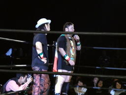 アントンとガッバーナがリングに(左写真)。アントン「お前ら実績もルックスも客の支持率もないじゃないか!恥ずかしくないのか!結果残してから来いよ。ということで俺たちがタッグタイトルには挑戦する。」