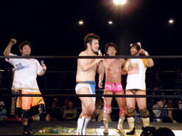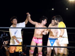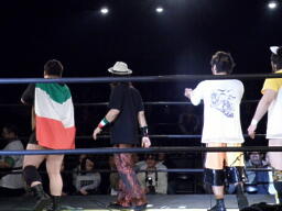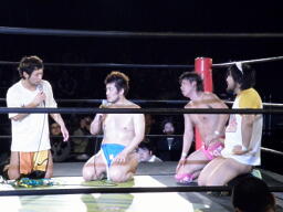 高梨「石井よく頑張った!そして言いたくないがチャンピオン、防衛おめでとう。今度はベルトハンター×ハンター最強の挑戦者、この俺マサ高梨と佐藤光留が」そこにイタリアン・フォーホースメンのテーマ。