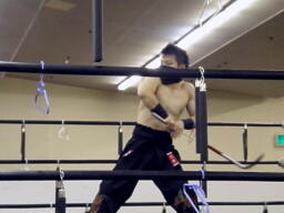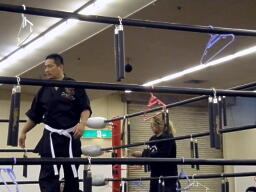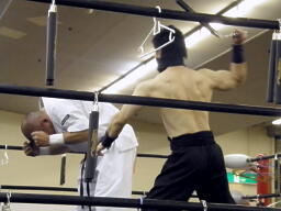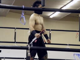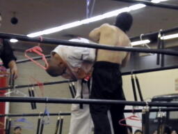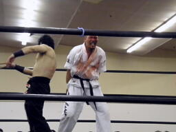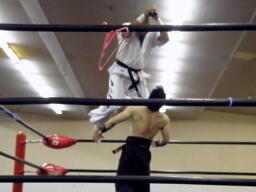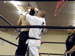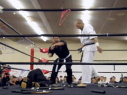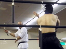 そしていよいよ試合。両者ロープからヌンチャクを取って睨み合い(左写真)。