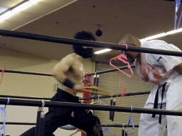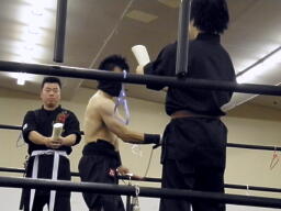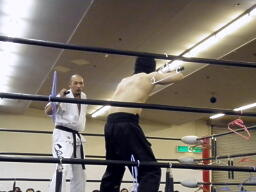 割って入ろうとする高木審判にもヌンチャクで一撃(右写真)。5分経過。