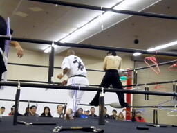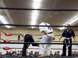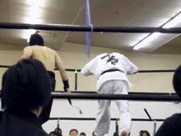 宏樹ダウン(左写真)、カウント6で立つ。今回一部押忍闘夢ルール採用のためダウンカウントは7だった。