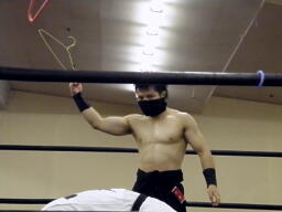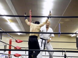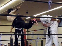 宏樹はヌンチャクを6本束ねるとコーナーからダイブ(左写真)、千春はダウン、高木審判が即KO宣告。