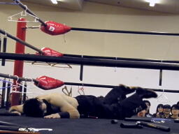 しかし千春の下段蹴りでひっくり返る(右写真)、宏樹場外エスケープ。戻ってこないので千春が場外に出て連れ戻す。