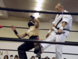 試合前「この試合はヌンチャク100本デスマッチと発表されていましたが、不況の影響でヌンチャク100本の製造が間に合わず、ヌンチャクは50本とし、残りはハンガーとします」という発表が。なんでヌンチャクの代わりがハンガーかわからない人は「刑事物語 ハンガー」でググってみよう。ヌンチャクとハンガーが四面のロープに設置され、立会人兼審判の高木三四郎が入場(右写真)。