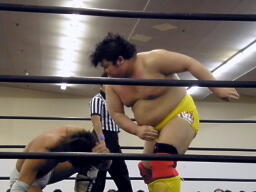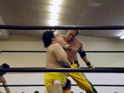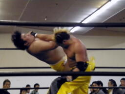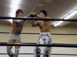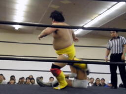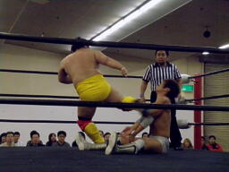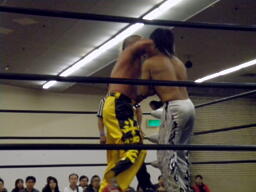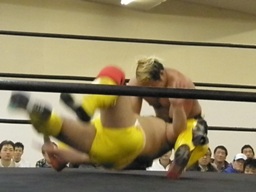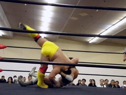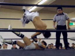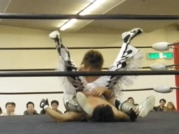 MIKAMIロープに振る、高尾回転エビ固め(右写真)、カウント2。MIKAMI起き上がってロープに飛ぶ、高尾カウンターのドロップキック、斗猛矢にタッチ。