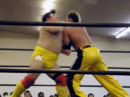 MIKAMI腕を取る、高尾ホイップ(右写真)、足のすくい合いからブレーク、両軍タッチ。