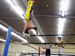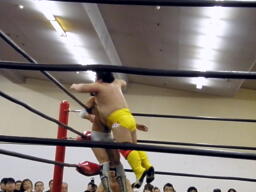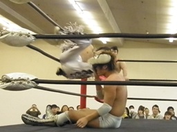 MIKAMIコーナーに振る、斗猛矢はコーナーで倒立(左写真)。MIKAMIトップロープを揺らして落とす。斗猛矢はエプロンから回転エビ固め、MIKAMIノーカウントでブレーク。斗猛矢は高尾にタッチ。