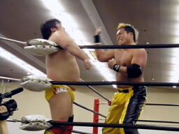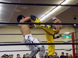 斗猛矢ラリアット、MIKAMI一回転。斗猛矢伊橋、MIKAMIにトラースキック連発(左写真)、MIKAMIをカバー、カウント2。
