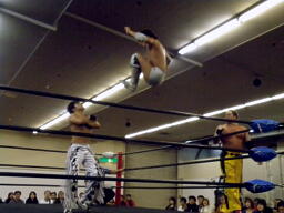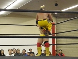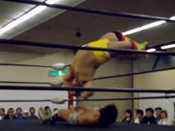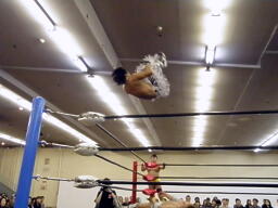 MIKAMIコーナーに上って450°スプラッシュ(右写真)、斗猛矢カット。MIKAMIは斗猛矢にデュランダル浴びせ伊橋にタッチ。
