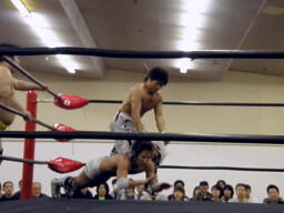 高尾突っ込む、MIKAMIガットショット、伊橋にタッチ。伊橋サッカーボールキック2発、上からパンチ(右写真)、ストンピング。