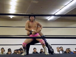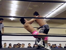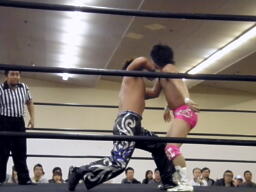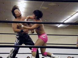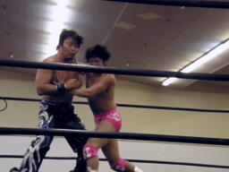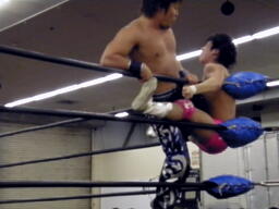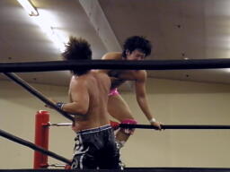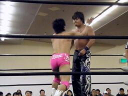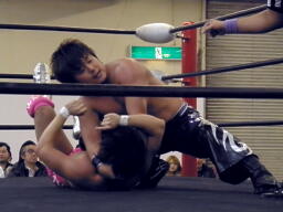 ロックアップ、HARASHIMAロープに押し込む、ブレーク。再度ロックアップ、HARASHIMAまたロープに押し込む、石井体勢入れ替えてエルボー、ブレーク。三度目のロックアップ、HARASHIMAバック取る(右写真)、グラウンドに。HARASHIMA首を取る、石井切り返す、HARASHIMAまた切り返す。