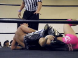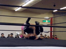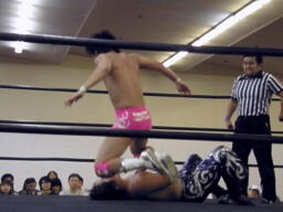 HARASHIMA山折り狙う、石井は高角度前方回転エビ固めに(右写真)、カウント2。